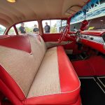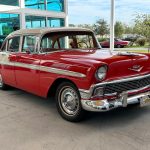 The exterior of this 1956 Chevrolet Bel Air showcases a stunning two-tone color combination of red and ivory. The vibrant red paint exudes a vibrant energy, while the ivory accents add a touch of sophistication and contrast. This timeless color scheme perfectly complements the car’s sleek lines and chrome accents, making it an attention-grabbing sight wherever it goes.